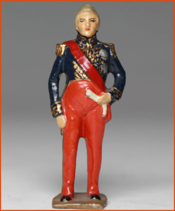 Charles VIII, roi de France (1470-1498). Il est le dernier représentant de la dynastie régnante des Valois directs. Fabrication ancienne de Gustave Vertunni, France, vers 1950. Figurine en plomb massif. Echelle 55mm à la ligne des yeux. Hauteur hors tout : 60 – 65mm.