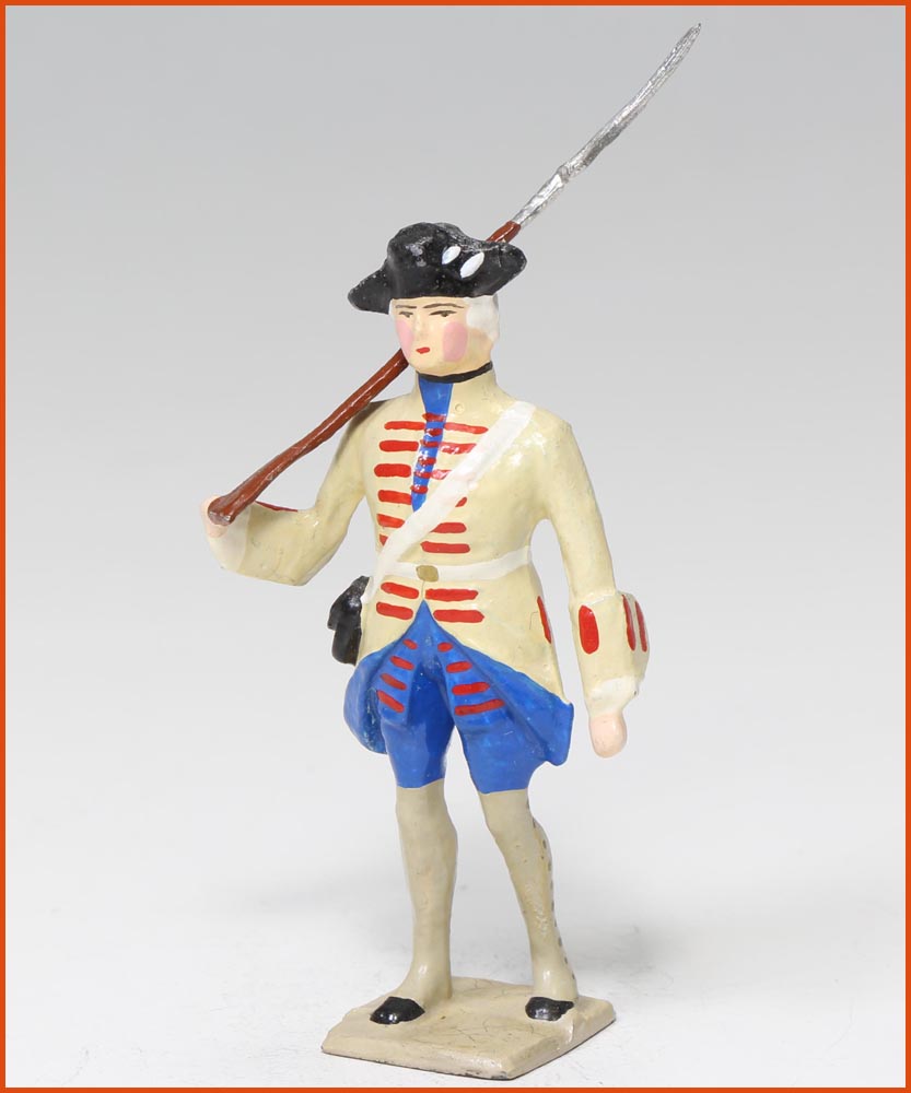 King’s Regiment. (1757). Louis XV period. Source: Lienhart & Humbert. Antique manufacture by Gustave Vertunni, France, circa 1940. Solid lead figure. Scale: 55mm to the eye line. Overall height: 60-65mm.