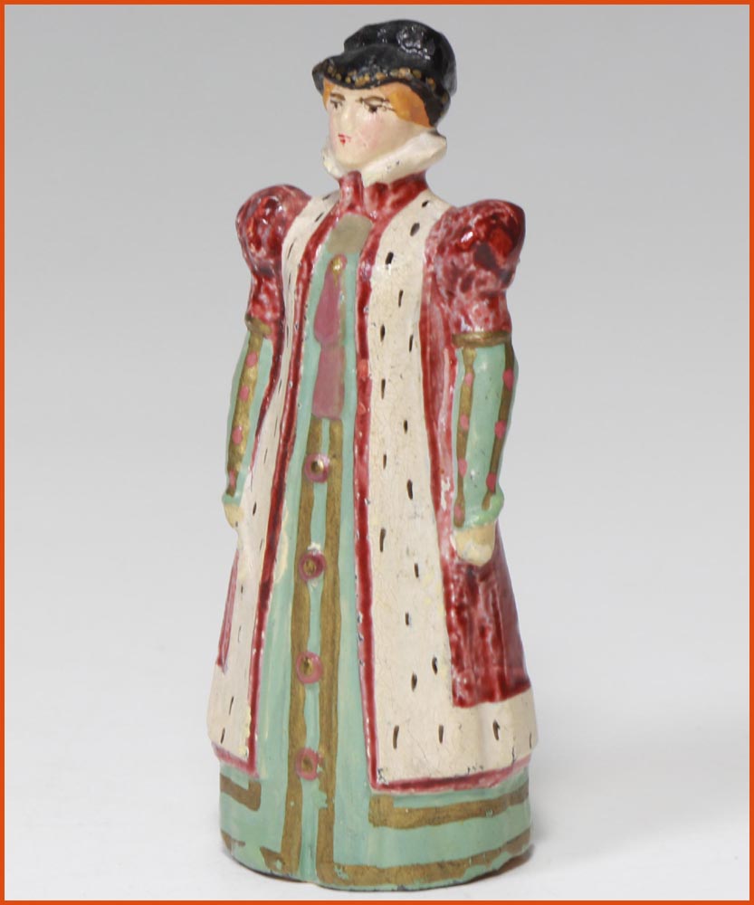 Jeanne d’Albret, Queen of Navarre (1528-1572). Only daughter of Henri II, King of Navarre, and Marguerite de Valois-Angoulême. She married Antoine de Bourbon. Their union produced the future Henri IV, King of France and Navarre. Early manufacture by Gustave Vertunni, France, circa 1940. Hollow lead figurine, filled with plaster. Scale 55mm to eye line. Overall height: 60 – 65mm.