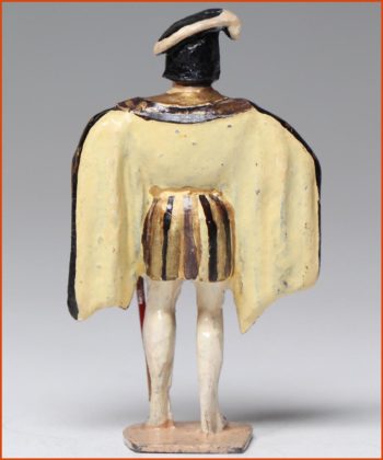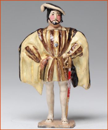 François I, King of France, (1494-1547). His reign saw all the splendor of the Renaissance blossom. Great protector of the arts, but also a man of war. He constantly opposed the Spanish pretensions. Leonardo da Vinci and the Mona Lisa, the victory of Marignan (1515) and the castle of Chambord are inseparable to him. Old manufacture of Gustave Vertunni, France, around 1950. Solid lead figurine. Scale 55mm at the eye line. Overall height: 60 – 65mm.