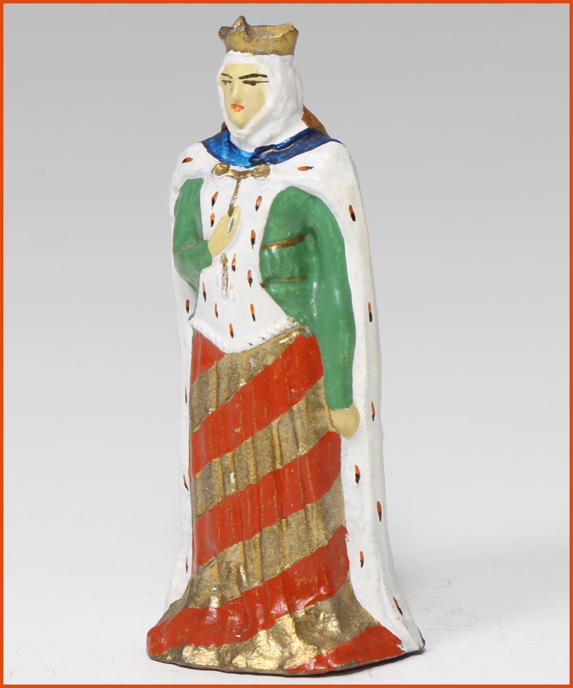 Jeanne de France (1464-1505). Daughter of Louis XI and Charlotte of Savoy. Physically deformed, she was nicknamed Jeanne La Boiteuse. Her father married her to Louis d’Orléans (future Louis XII). On the death of King Louis XI, she became regent of the kingdom, pending the coming of age of her younger brother, the dauphin, the future Charles VIII. He died very young, and she briefly became Queen of France. She devoted her life to prayer and charity. She was canonized in 1950. Early manufacture by Gustave Vertunni, France, circa 1940. Hollow lead figurine, filled with plaster. Scale 55mm to eye line. Overall height: 60 – 65mm.