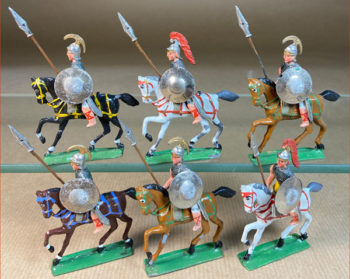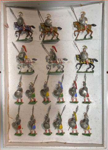 C.B.G. Mignot. Cuirassiers Prussiens vers 1885. Bel ensemble de douze cavaliers en boite d’origine, constitué d’un porte-étendard et d’un officier ainsi que d’un trompette et de neuf soldats. Les tie-cards sont manquants. Très bel état. Fabrication vers 1925. Dimensions : 32X29X5cm.