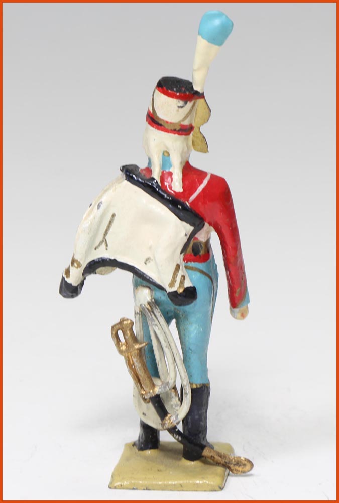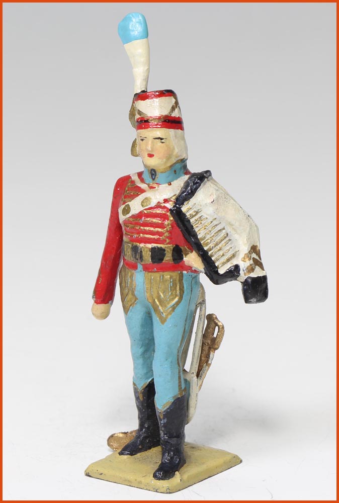 Officier du 6e régiment de hussards vers 1796. Anciennement, hussards de Lauzun.. Fabrication ancienne de Gustave Vertunni, France, vers 1940. Figurine en plomb massif. Echelle 55mm à la ligne des yeux. Hauteur hors tout : 60 – 65mm.