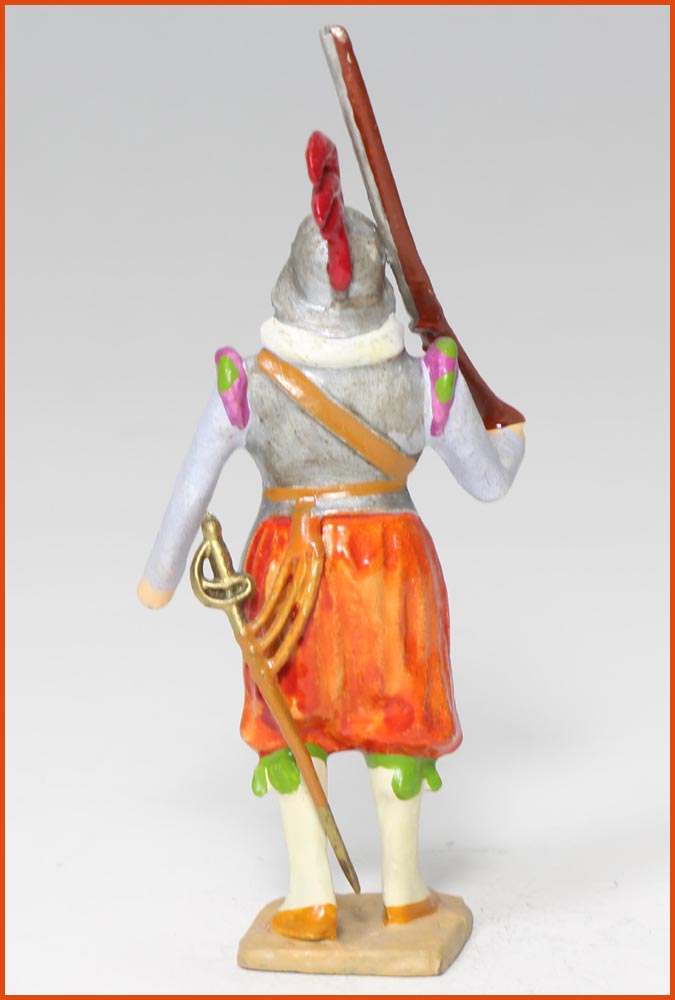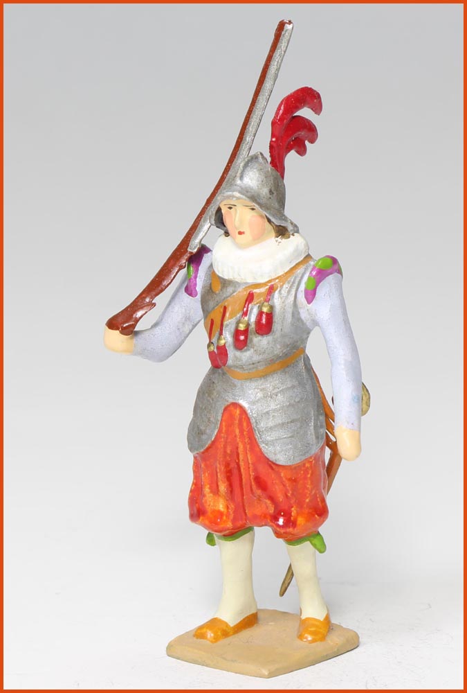Arquebusier. Epoque Henri IV, vers 1580. Fabrication ancienne de Gustave Vertunni, France, vers 1940. Figurine en plomb massif. Echelle 55mm à la ligne des yeux. Hauteur hors tout : 60 – 65mm.
