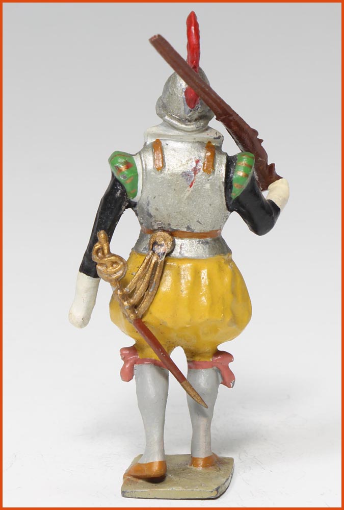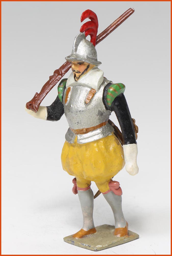 Arquebusier. Epoque Henri IV, vers 1580. Fabrication ancienne de Gustave Vertunni, France, vers 1940. Figurine en plomb massif. Echelle 55mm à la ligne des yeux. Hauteur hors tout : 60 – 65mm.