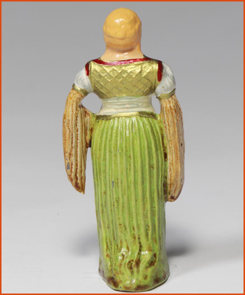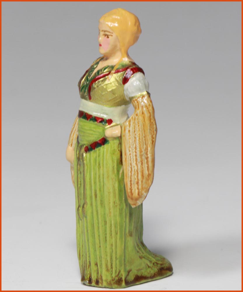 Clotilde (environ 474-545). Cette princesse chrétienne Burgonde devient la reine des Francs en épousant Clovis, qu’elle aida à se convertir au christianisme. La légende veut qu’en passe de perdre la bataille de Tolbiac, Clovis invoqua Jésus et jura de se convertir s’il remportait la victoire. Elle fut canonisée vers 1550. Fabrication ancienne de Gustave Vertunni, France, vers 1940. Figurine en plomb massif. Echelle 55mm à la ligne des yeux. Hauteur hors tout : 60 – 65mm.