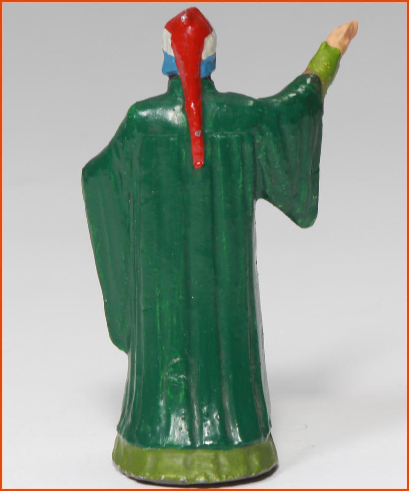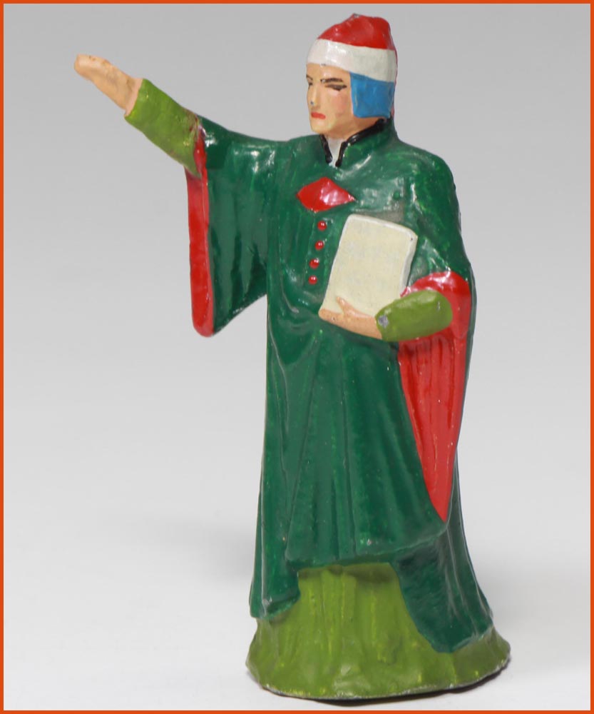 Dante Alighieri (1265-1321). Poête et écrivain Florentin. Il est surtout connu pour son ouvrage magistral « La Divine Comédie », considéré comme une des œuvres littéraires majeures de l’humanité. Fabrication ancienne de Gustave Vertunni, France, vers 1940. Figurine en plomb creux, remplie de plâtre. Echelle 55mm à la ligne des yeux. Hauteur hors tout : 60 – 65mm.