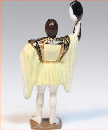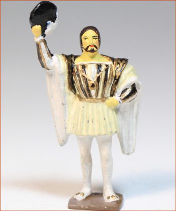François 1er, roi de France, (1494-1547). Son règne voit s’épanouir toute la splendeur de la renaissance. Grand protecteur des arts, mais aussi homme de guerre. Il s’opposa sans cesse aux prétentions espagnoles. Léonard de Vinci et la Joconde, la victoire de Marignan (1515) et le château de Chambord lui sont indissociables. Fabrication ancienne de Gustave Vertunni, France, vers 1950. Figurine en plomb massif. Echelle 55mm à la ligne des yeux. Hauteur hors tout : 60 – 65mm.