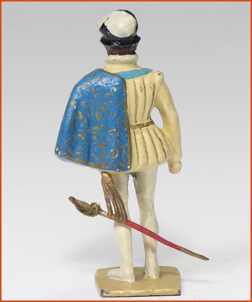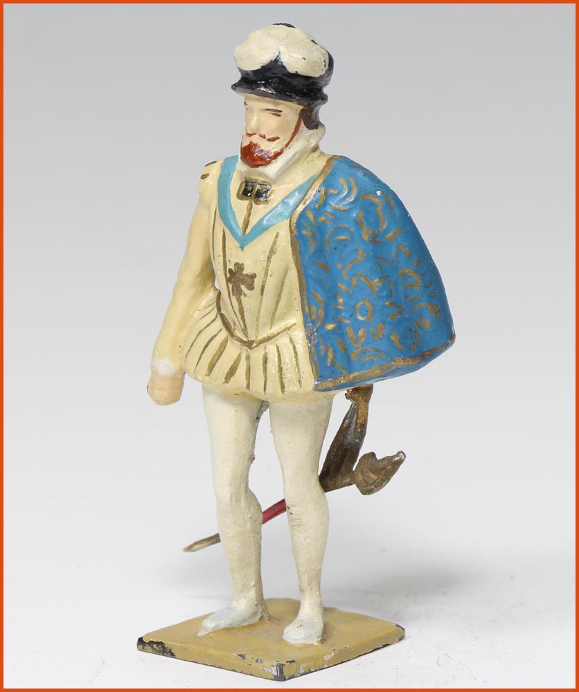 Henri de Lorraine, duc de Guise (1550-1588). Il est un des principaux chefs du parti catholique durant les guerres de religions. Il participe notamment au massacre de la Saint-Barthélemy. Son ambition politique finit par irriter le roi Henri III qui commandite son assassinat à Blois en 1588. « Il est encore plus grand, mort que vivant » aurait prononcé le roi contemplant son cadavre. Fabrication ancienne de Gustave Vertunni, France, vers 1940. Figurine en plomb massif. Échelle 55mm à la ligne des yeux. Hauteur hors tout : 60 – 65mm.