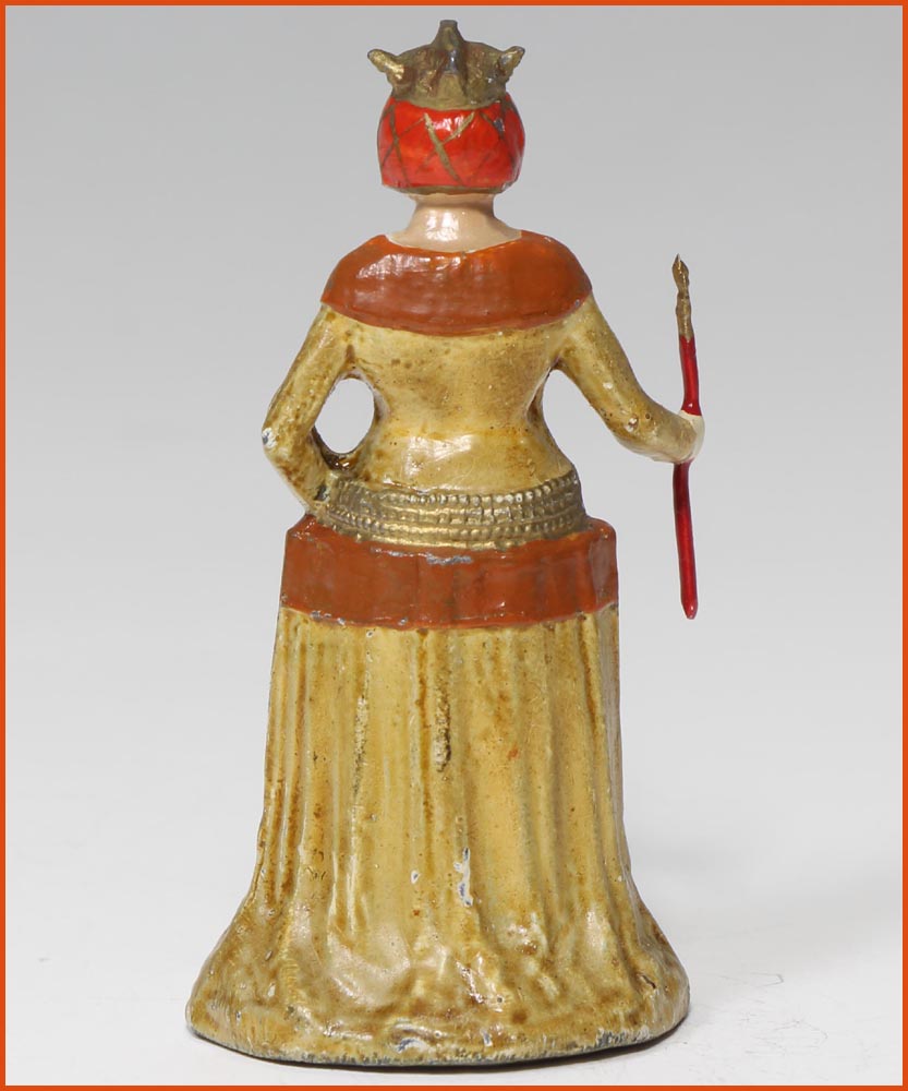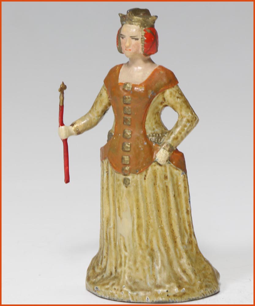 Jeanne de Bourbon (1338-1378). Elle épouse le futur Charles V, et devient reine de France en 1364, à la mort de Jean Le Bon. Fabrication ancienne de Gustave Vertunni, France, vers 1940. Figurine en plomb creux, remplie de plâtre. Échelle 55mm à la ligne des yeux. Hauteur hors tout : 60 – 65mm.