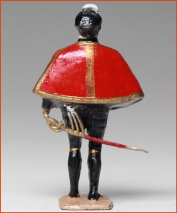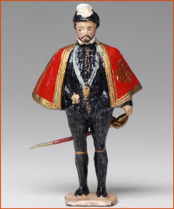 Jeanne d’Albret, reine de Navarre (1528-1572). Fille unique d’Henri II, roi de Navarre, et de Marguerite de Valois-Angoulême. Elle épouse Antoine de Bourbon. De leur union naitra le futur Henri IV, roi de France et de Navarre. Fabrication ancienne de Gustave Vertunni, France, vers 1940. Figurine en plomb creux, remplie de plâtre. Échelle 55mm à la ligne des yeux. Hauteur hors tout : 60 – 65mm.