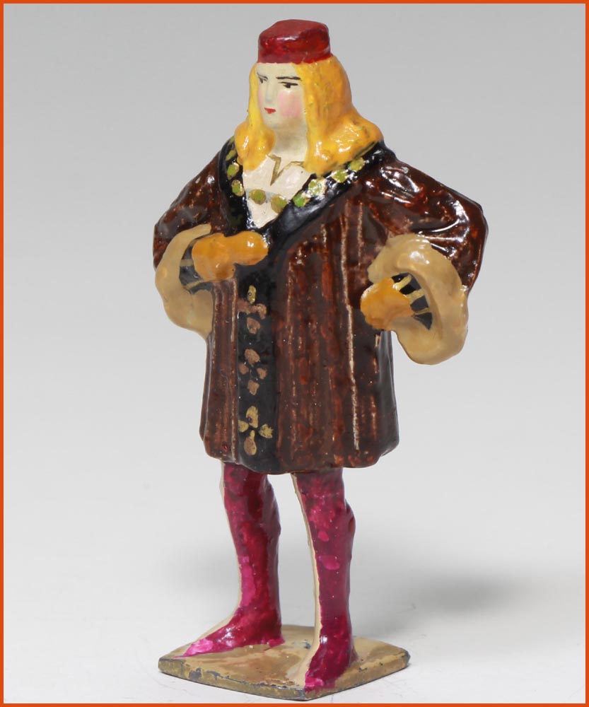 Louis 1er, duc d’Orléans, né en 1392. Il est le frère cadet du roi Charles VI. Il meurt assassiné sur l’ordre de son cousin, Jean Sans Peur Duc de Bourgogne. Fabrication ancienne de Gustave Vertunni, France, vers 1950. Figurine en plomb massif. Echelle 55mm à la ligne des yeux. Hauteur hors tout : 60 – 65mm.