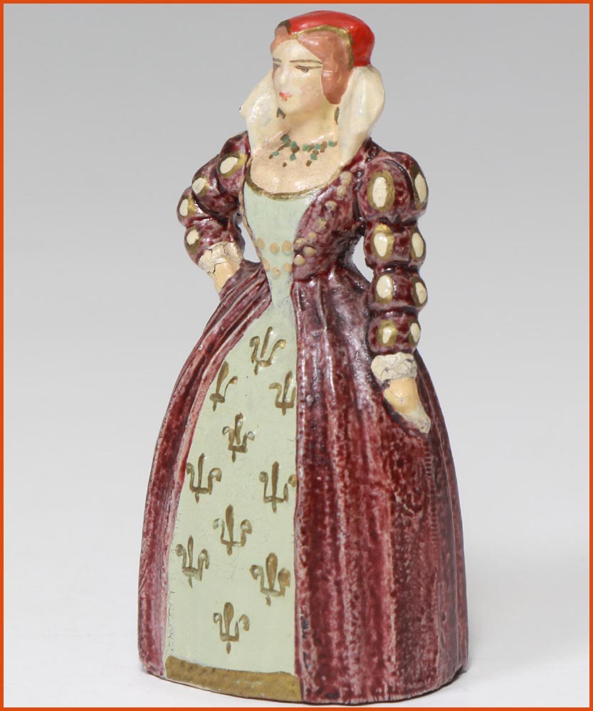 Marie Stuart, reine d’Ecosse. (1542-1587). Elle épouse le roi François II et devient reine de France. De retour en Ecosse et jugée pour trahison, elle meurt décapitée, après un long emprisonnement. Fabrication ancienne de Gustave Vertunni, France, vers 1935. Figurine en plomb creux, remplie de plâtre. Echelle 55mm à la ligne des yeux. Hauteur hors tout : 60 – 65mm. Version 1. Rare.