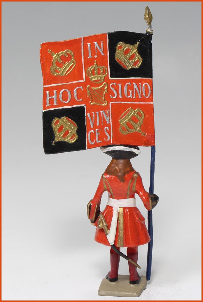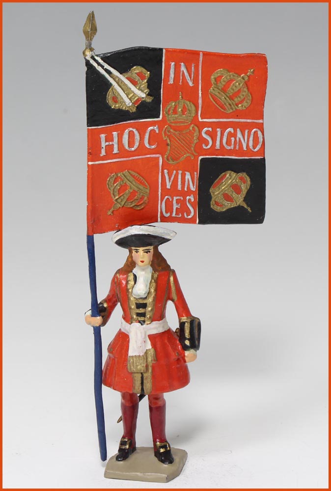 Régiment de Dillon (1733). Époque Louis XV. Régiment Irlandais au service de la France. Source L. Mouillard. Drapeau du grand modèle. Fabrication ancienne de Gustave Vertunni, France, vers 1940. Figurine en plomb massif. 60 – 65mm. Hors-tout, 115mm.
