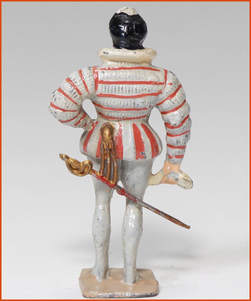 Paul de Stuer de Caussade, marquis de Saint-Mégrin ou Saint-Maigrin, (1554-1578). Il était un des « mignons » (gardes du corps), du roi Henri III. Il fut assassiné sur l’ordre du duc de Guise. Fabrication ancienne de Gustave Vertunni, France, vers 1950. Figurine en plomb massif. Echelle 55mm à la ligne des yeux. Hauteur hors tout : 60 – 65mm.